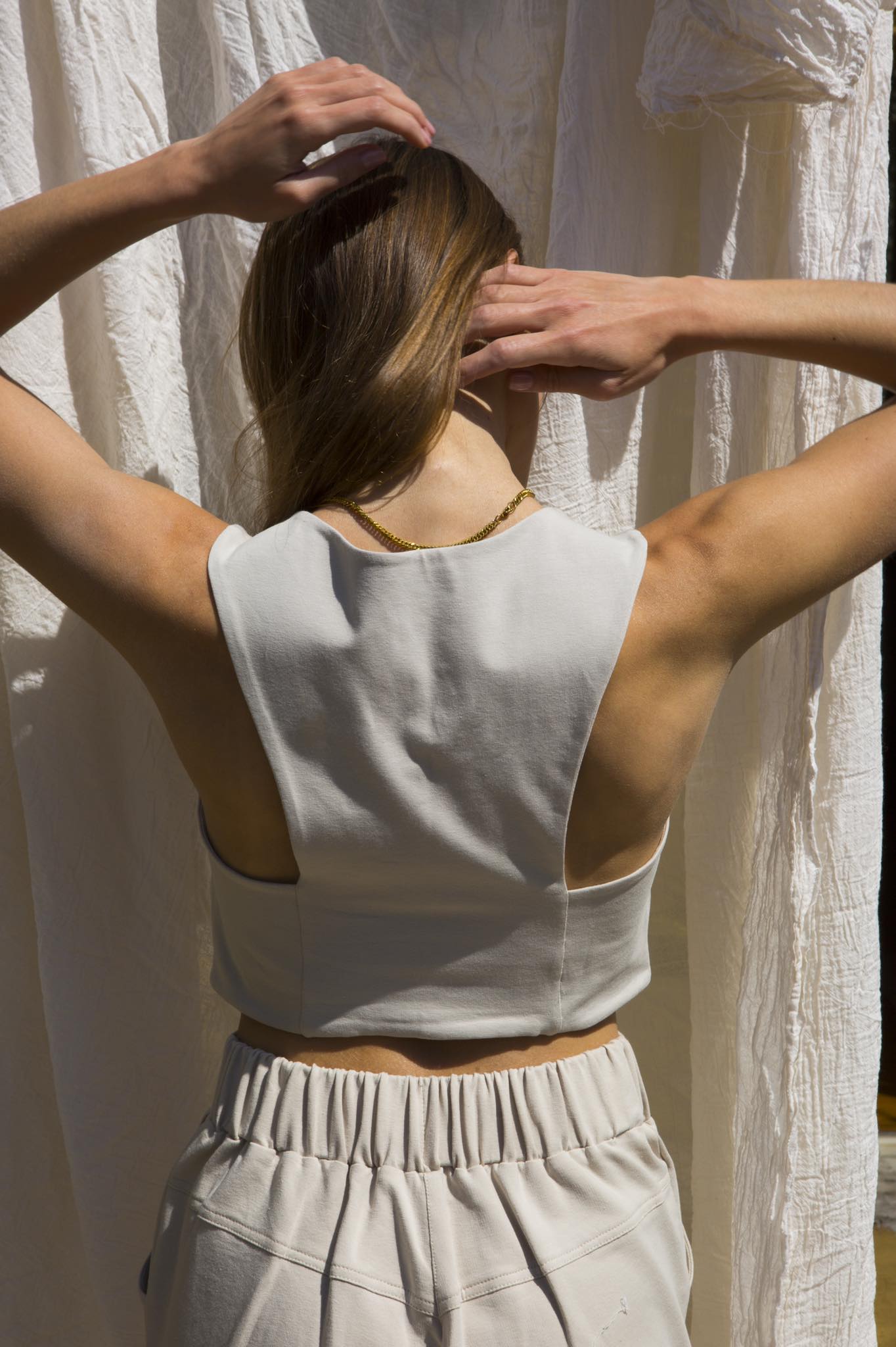 Crop top with side cutouts. At the front, it rises high to the neckline, accentuating the shoulders. Crafted from natural fabric with double stitching, it provides comfort and security in every movement.